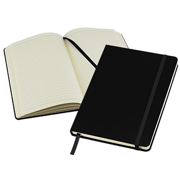 Cuaderno tipo “Colorskine” tamaño A5, con cubierta de cartón piedra forrada en PU (cuero sintético) de color, de 1.5mm de espesor. Interior 80 hojas lineadas amarillas de 80gsm. Incluye banda elástica y huincha separador de hojas al tono. Presentación individual en bolsa de polipropileno.