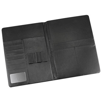 Carpeta Simil Cuero Negro. En el interior incluye Bolsillos para documentos tamaño A4, Compartimentos para Tarjetas Y Porta-Lápices.