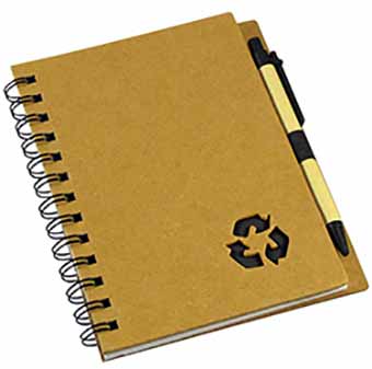 Cuaderno Ecológico con Tapas Duras de Cartón Reciclado 650gsm, 70 hojas interiores lineadas y anillado metalico doble cero. Incluye Bolígrafo Ecológico y logo “Reciclable” troquelado en la tapa.