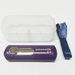 Práctico Timbre Tipo sello de bolsillo, manual, con tampón incluído, el cual puede ser recargado con la tinta para sellos de goma Automatik o en el caso de recambio sólo puede ser efectuado por el fabricante.