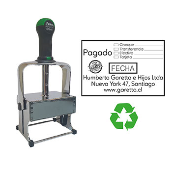 Timbre de Goma montado en una practica caja automática, el cual sirve para timbrar diferentes tipos de papel. Es apto para alto tráfico. Su tampón alcanza para mas de 10.000 impresiones, antes de...
